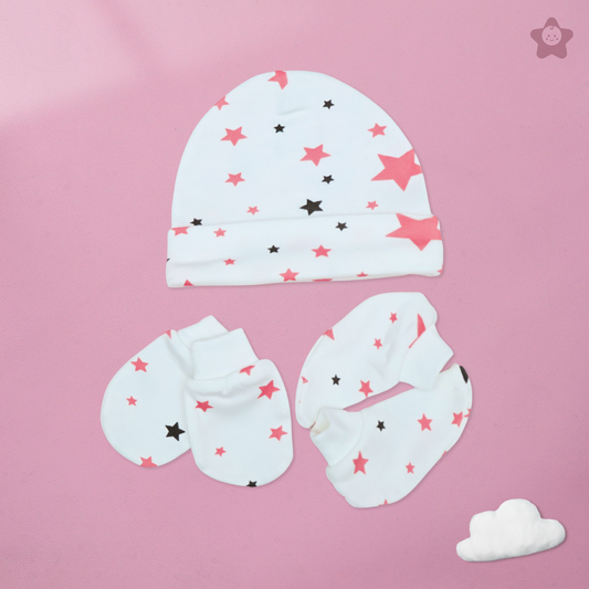 Cap Mittens Booties Set - 100% Ultra Soft Cotton Combo Set Stars (Fuchisa)