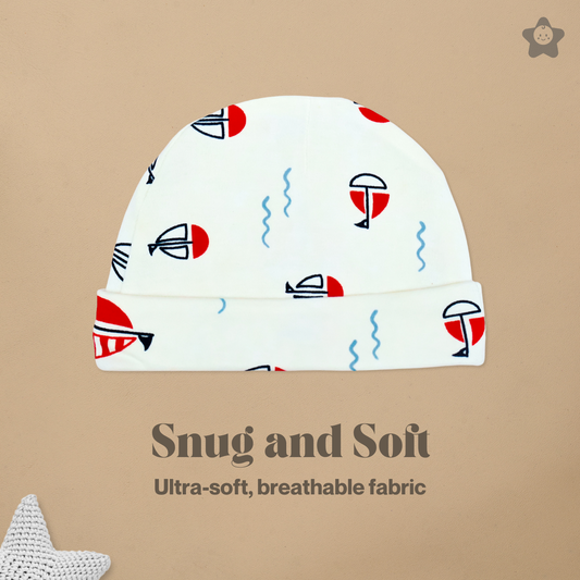 Cap Mittens Booties Set - 100% Ultra Soft Cotton Combo Sailing Boats print