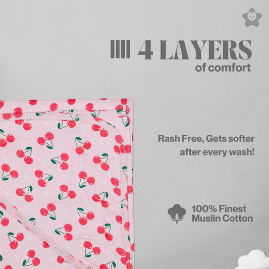 Cherry Charm Hooded Wrapper Bath Towel - 100% Soft Muslin Cotton (Pack of 1)